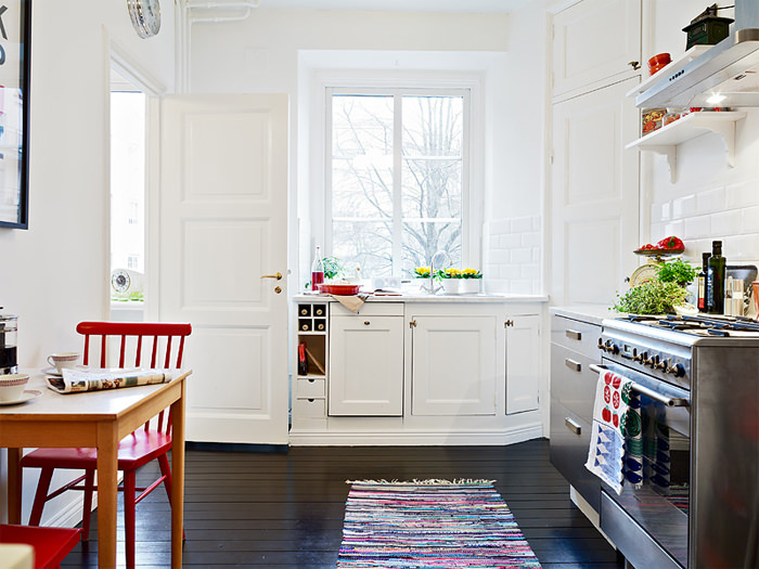 Uma cozinha toda ela em branco com elementos de cor a sobressair ao estilo escandinavo com luz natural o que a torna simples e elegante, uma sala - de - estar com imensa luz natural branca, com objectos de decoração em preto, tons cinza e madeira e por fim um quarto paredes pretas e brancas com luz natural e os objectos decoração com plantas e objectos também eles em branco.
